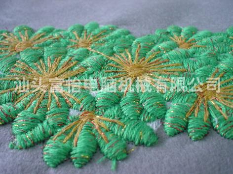 花式纱绣、绳绣、锯齿绣、捆绑绣、包梗绣、反底绣、并股绣、仿手绣等。