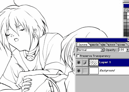 在图层中最好把线条单独提出来,虽然可能会用不到但为了长远着想还是提出来的好,如果不打算留的话请把线稿层的属性放‘透明’。