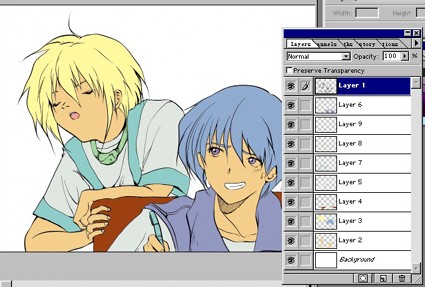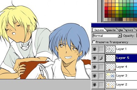 2、不一定每个部分一层,.只要两个范围离的不是很近,也就是一笔下去不会牵连到另外一个范围的话就可以放在一层,像这张两人的头发虽然是不同颜色也放在同一层了。