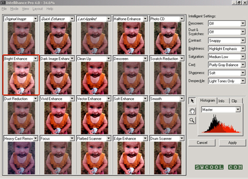 Extensis Intellihance滤镜提供按键式地自动调整图的对比度、亮度、饱和度、偏色和锐度,自动去网纹和除尘,可在最短的时间内生成效果最好的图片。