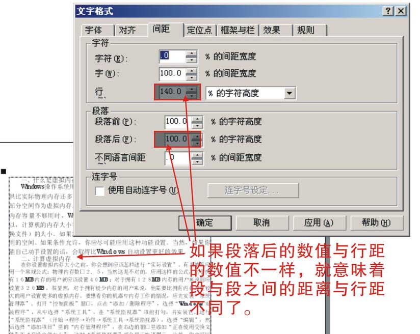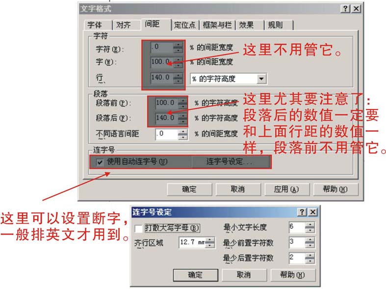 c 间距面板:设定字距、行距的地方。我一般是这样设定的:字符:0 字:不管它 、行:140 、 段落前:不管它 、 段落后:140 、 不同语言间距:不管它 (如图6)