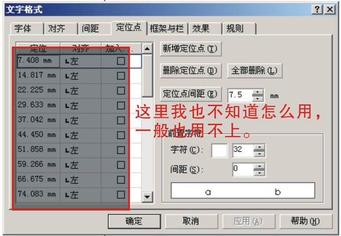 我们来仔细观察这个面板,发现功能还是挺多的。(如图4)a 字体面板:设定字体、字号等。一般在属性栏里就可以设置。b 对齐面板:设定对方式的。如果是段落文本就一定要选中“完全齐行”了。右下角有一个“缩排”选项,其中“第一行”是设每一段文字第一行空两格的地方。一般用9号字,输入7mm就行了,字号越大,此处输入的数字也就相应增大。此面板其他地方就用默认的好了。(如图5)[ Last edited by succeedad on 2004-8-22 at 15:57 ]