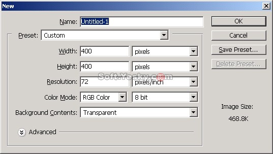 1、运行Photoshop CS,新建一个大小为400×400像素、分辨率为72像素/英寸、背景颜色为透明的文件,具体设置如图1所示。 注意这里的颜色位数为8位(bit),否则后面不能用Render滤镜。