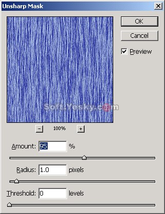 8、选择菜单命令“Filter>Sharpen>Unsharp Mask”(滤镜>锐化>Mask式清晰化),设置数量(Amount)为95%,半径(Radius)为1,阈值(Threshold)为0,如图6所示。Unsharp Mask滤镜用于调理图案边缘细节的对比,并且在边缘产生修正明暗交接线,从而提高图像的清晰度。对两个图层都应用该滤镜,使纹理更加清晰。