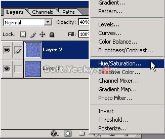 9、单击图层面板下方的“Create New Fill or Adjustment Layer”(创建新填充或调整图层)图标,从弹出菜单中选择“Hue/Saturation”(色调/饱和度),如图7所示。