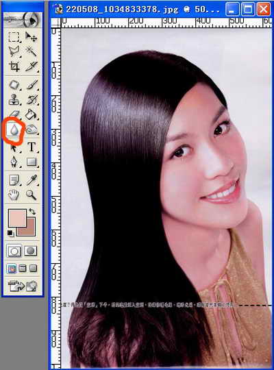 说起为数码照片中的人物脸部磨皮,真是累人的活儿!其实磨皮有很多种方法,最简单的是用水滴工具。这方法适用于不脏的皮肤。我个人认为压力还是用100%的好!直接在皮肤上涂抹就可以了。原图如下: