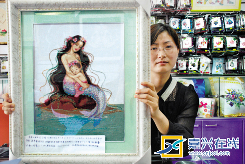 这是一件镶着镜框的十字绣作品:一个美人鱼披着一头棕色的长发,怀抱一个瘦小的男孩,倚靠在深色的海边,蓝色的鱼尾巴闪着点点金光,显得格外夺目。