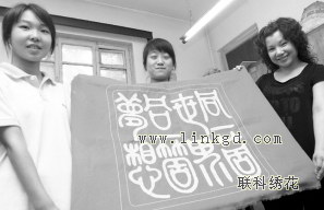 红色绸缎上绣着10个金色的大字:同一个世界,同一个梦想。字体采用的是汉篆,庄重优雅,洋溢着浓郁的传统文化特色。“这是我们学校的两名老师和学生合作,用了两个半月时间绣制的,刚刚完成。”13日上午,市九十五中的张老师说,为了表达对奥运的支持,师生们采用十字绣这种具有民族特色的艺术形式将北京奥运口号绣出来,作为对北京奥运会的献礼。