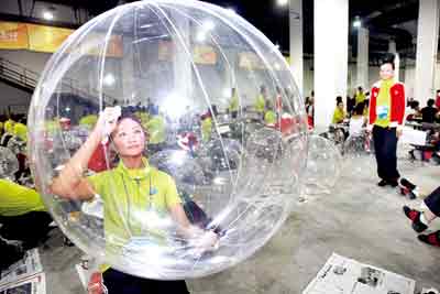 在地下停车场里记者看到,在写有第29届奥运会开闭幕式演员化妆指挥调度中心的大厅里,工作人员正在忙碌地为演员化妆。