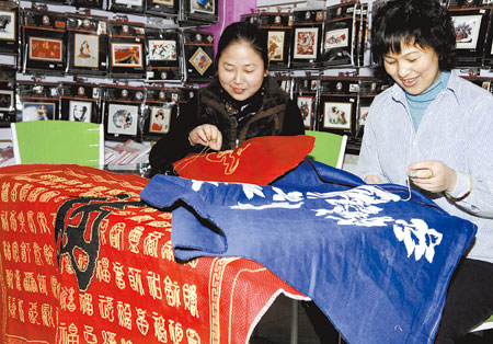 12月10日,省城一家十字绣店铺里,店员忙着绣十字绣。和过去只卖十字绣材料不同,现在很多十字绣店同时代绣成品,有的店还招收绣工,催生了新一代“绣女”。据了解,在十字绣店铺兼职代绣的有学生、下岗职工、家庭主妇,还有退休在家的老年人,熟练绣工一个月能有上千元的收入.
