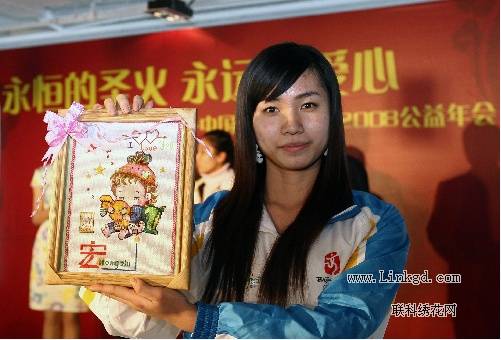 北京,2009年1月10日 (体育)(1)永恒的圣火 永远的爱心 1月10日,礼仪人员在慈善义卖活动现场展示由房山中学宏志班贫困学生手工制作的“十字绣”。当日,“永恒的圣火 永远的爱心”——中国火炬手联盟2008年公益年会”在京举行。年会现场举行了慈善义卖活动,本次活动的全部募捐所得将用于捐助宏志班贫困学生和2009年“重走火炬路 圣火耀神州”大型公益活动的慈善项目。
