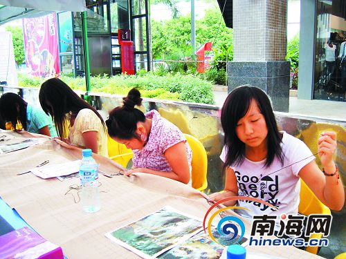 本报海口4月6日讯(记者纪燕玲实习生李晓曼摄影报道)今天上午,在海口大型休闲购物中心上邦百汇城步行街上,海口热心市民自发参与绣制《清明上河图》,绣成后上邦百汇城将把该图拍卖,得款捐献省慈善总会。