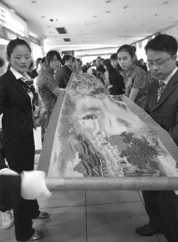 据了解,此巨作是为了庆祝义乌皇室蒙娜丽莎形象店成立8周年而特地从上海空运来的,绣品全卷长22米,由18位熟练技师耗时180天完成,纯棉面料,使用了116505米长的埃及长绒棉绣线,共计2032611针。整幅长卷重20公斤,是目前世界上最长的十字绣艺术品,随后将申请吉尼斯纪录。