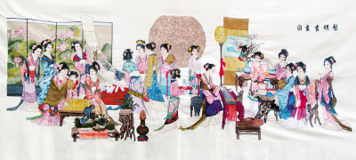 “最开始绣的那几幅作品,我其实很不满意,因为绣的时候心里很乱。于是我决定找一幅大一点的作品,这样就不会着急绣完,心也会静下来。”在寻找草图的时候,一幅3.8米长、1.42米宽的《琴棋书画图》打动了张丽芳,看着草图上几名古装仕女抚琴作画的优雅姿态,张丽芳被吸引了,她立刻掏钱买了下来。