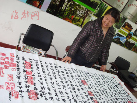 林丽霞说,这幅作品是她去年花了两个多月绣成的。“学刺绣纯属偶然。”她说,2007年,她路过仙游城关时,看到人家在刺绣,她一下子就被吸引住了,于是也开始买回刺绣图案和针线练习。开始她绣的是山水和花鸟,手法越来越熟练。去年8月,她经过一家刺绣店,无意中发现一幅书法刺绣的图案很好看,就买回来刺绣。