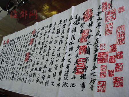 全文三百二十五个字和三十三枚篆刻印章全部绣在布上