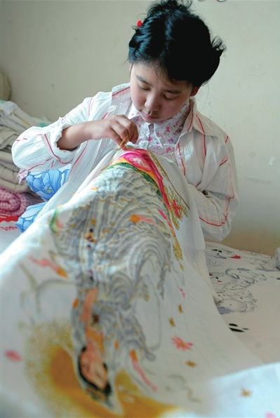 胡杨正给一幅观音十字绣图锁边。她2007年6月被查出患有白血病后,得到了许多人的帮助。如今她已做完骨髓移植,病情基本得到控制,想做点事回报恩人。“我十字绣绣得挺好的,就送十字绣吧”。她说,住院期间爱上了十字绣,这幅图她从去年10月初绣到现在,想送给山东日照的李女士,李女士曾捐给她几万元钱。装裱后的十字绣是玻璃蒙面,易碎,胡杨希望有近期到山东日照的人帮她带给李女士。