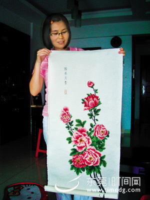 但是,大家无非是绣绣小钱包、钥匙扣等一两千针的小玩意,至于那些需要费时间的枕头套,挂饰喜欢的人们,则多数选择购买成品。盛女士最近却完成了一幅大作——10万针以上的作品:《花来富贵》。