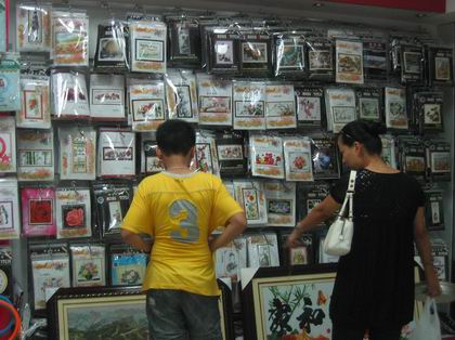 在世贸城针织内衣服装专业市场A区,有一家规模较大、生意不错的十字绣店铺。无论是长达数米的大幅作品,还是手机挂件,都可以在这里找到踪迹,价格从几元到上千元不等。据店家介绍,“福”字系列的十字绣最受市民的欢迎,不论是百福图还是单个“福”字都卖得很好;另外,招财进宝、家和万事兴、大展鸿图、生意兴隆等带有良好寓意的十字绣也都很受欢迎。