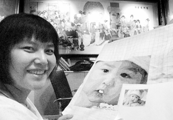 用针和丝线把一张照片“还原”到布面上,8月6日,在和平区文化路王硕的小店里,记者看到了她的作品:“十字绣”上绣的正是她的9个月大的女儿。