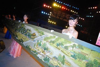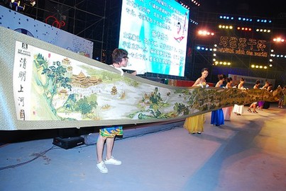 青岛新闻网8月24日讯 8月23日晚,一幅史上最长的22米十字绣《清明上河图》在啤酒城中心舞台亮相,为青岛市民带来一个意外惊喜。