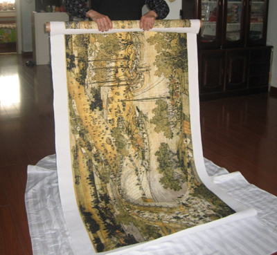 来源:www.artxun.com在孙明军家里,摆着多幅十字绣作品,其中一个巨幅《福字》作品是孙明军的爱人杨秀英所绣,谈到孙明军为何有刺绣的爱好,夫妻俩打开了话匣子。原来,孙明军当初搞刺绣完全是为了和妻子“较劲儿”。三年前,杨秀英闲暇无事便在家绣十字绣,孙明军看着觉得挺简单。“简单?这活儿可是考验耐力的,女人一般都绣不了,你能行?”妻子的话激起了孙明军的“斗志”,一向要强不服输的孙明军为了证明自己能行,便也开始学着刺绣,他研究出一手在布上、一手在布下,上下穿针的快速绣法,和妻子比赛,几天下来,他果然比妻子绣得又快又好。更让妻子对他刮目相看的是,孙明军硬是利用2年半的下班休息时间,完成了巨幅《清明上河图》。记者翻看作品的背面,发现针线缜密细致,可见绣工了得。