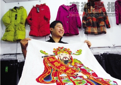 红网长沙11月9日讯 提起十字绣,人们都会想到妙龄少女。但是,在长沙市岳麓区坪塘镇信天游商业街,一个五大三粗的小伙子,天天飞针走线,绣出一幅1米多高的“财神爷”。原来,小伙子一次意外受伤后,拿起了绣花针。