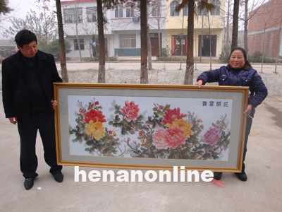 村妇徐云霞利用闲暇时机,绣成“牡丹花”