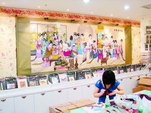 在深圳中心书城的二楼,有间“十字绣”店,店里迎面占满一面墙的“琴棋书画”仕女图吸引了不少人进店欣赏。店中央摆着一张长方形大桌,桌边围坐着七八个中小学生,都在埋头绣“十字绣”。在这里呆上几分钟,你会感到一种安详、平和、静谧的气氛,你会忘记身处快节奏的现代深圳,而恍若回到了古代社会小姐的绣房。