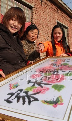 1月22日,河南省内黄县田氏镇汤东村几名农民女青年正在交流“十字绣”经验。农闲时节,在河南省内黄县农村,十字绣受到当地女青年的追捧,学习十字绣技术成为一种时尚。