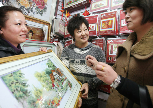 2月8日,冯洁(中)、冯志慧(左)姐妹俩为顾客介绍十字绣工艺品。2001年,冯洁在新疆伊犁哈萨克自治州五金公司下岗,2008年,她与妹妹一起参加了伊宁市劳动局举办的就业培训,并贷款3万元开起了十字绣工艺品店,生意红火,年收入达6万余元。