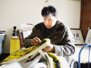 在妻子的帮助和自己的不懈努力下,半个多月后,孙兴平手中的针线终于慢慢听话了。穿线、配色、构图……孙兴平的动作看上去有板有眼。看着自己绣的“花开富贵”、“百鸟朝凤”、“佳松迎客”等十字绣,孙兴平不仅从中得到了生活的乐趣,还给家里带来了收入。