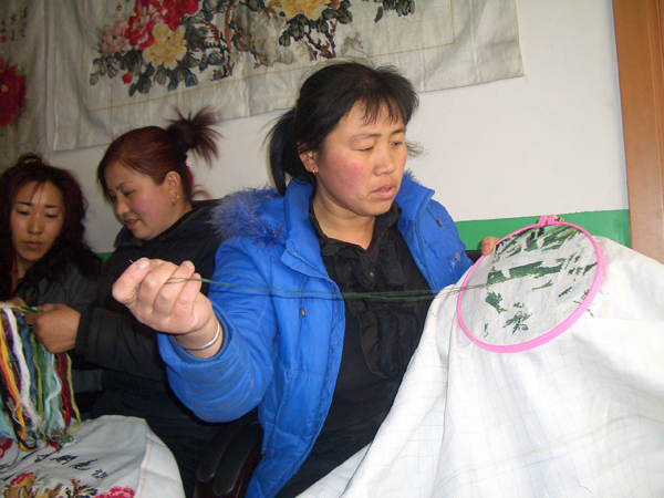 绥棱县双岔河镇双泉村120名妇女农闲时加工十字绣,以山水花鸟和卡通人物为主,市场供不应求。加工十字绣成为村民增收的新途径。村民顾立冬(右一)从去年11月份开始加工十字绣,到今年3月份绣了10多幅,收入两万多元。