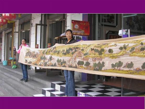 该十字绣为仿宋时的清明上河图,绣工精细,色彩古朴大方,搭配协调,线条流畅,从整个图案上看,有人有船有桥有动物,反应当时繁华景象。形像逼真,具有一定的观赏性和艺术性,有极高的收藏价值。