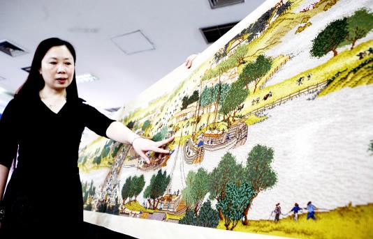 杨小伟在展示自己刚完工的十字绣《清明上河图》。