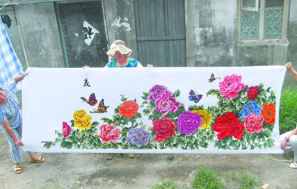 卖绣品尝到甜头后,她又花了2000多元钱买了幅“花开贵人家”,这幅作品有4米长,72种颜色的绣线。每天天刚亮金淑英就开始绣,天色暗下以后,她就不绣了。一天最少要绣10个小时,就这样她绣了9个月,“到8月中旬,就可以完工了。 ”