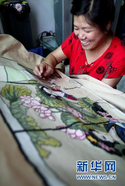 8月6日,山西运城市和平小区下岗女工张华英在创作十字绣作品《琴棋书画》。 今年50岁的张华英是在下岗后搞起家庭绣坊的,她以制作风光、人物等十字绣工艺品来增加家庭收入。从2009年开始,张华英历时一年创作了长2.2米,宽0.9米的十字绣作品《清明上河图》。