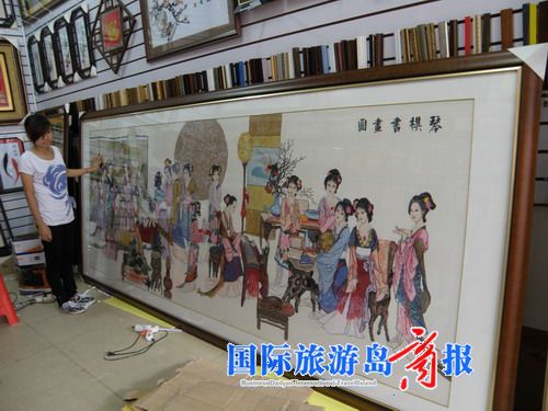 昨日下午,商报记者在海口市博爱北路某相框商行见到了这副刺绣精美的十字绣。十字绣的主人海口市蔡先生告诉记者,她妻子孔女士去年陪儿子到山东某大学读书,在照顾儿子的同时,一边做小生意一边绣十字绣。经过一年多的时间,终于绣成一副3.65米×1.55米的巨幅“琴棋书画图”十字绣。他称曾有人开高价欲买走妻子该巨幅十字绣,但终因难以割舍婉言拒绝。