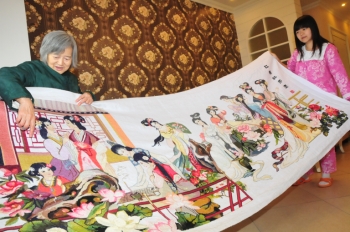 一次,王建辉老人意外地发现枕套上的图案很漂亮,就开始学着绣。从好奇、尝试、迷恋,直到现在的欲罢不能,渐渐地便忘掉了麻将。据王建辉老人介绍,去年的一场大病,让家里人为自己操碎了心。儿孙们的孝顺让自己很欣慰,于是想给子孙们一个纪念,于是决定绣《红楼群芳图》送给后人。
