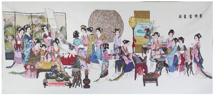中国文化渊源流长,自古以琴棋书画最为胜行,琴棋书画图源自《红楼梦•琴棋书画图》,图中系红楼梦中记载12位金钗美女和六位仕女组成的琴、棋、书、画之美丽场景,图中18位美女各个神态安然,十分逼真地突显了棋之趣、书之渊、琴之妙、画之真,古典之美跃然布上,尽显中国文化之底蕴。前谈唐诗巧弹琴,后对歌赋妙盘棋;左聊宋词迷经书,右侃人生美如画;前后左右谈对聊,琴棋书画乐无穷。绣品绣工精致,正面全部是一个方向压线,背面全部是竖背,无接头,无错针漏针,绣布为米黄色,更使得绣品成为雍容华贵之典范。图片为实物拍摄,技术有限,又没有进行任何加工处理,效果不能完全展现出来,还可能会有色差,但是实物色彩更加鲜明,尚未装裱,装裱后效果绝佳。