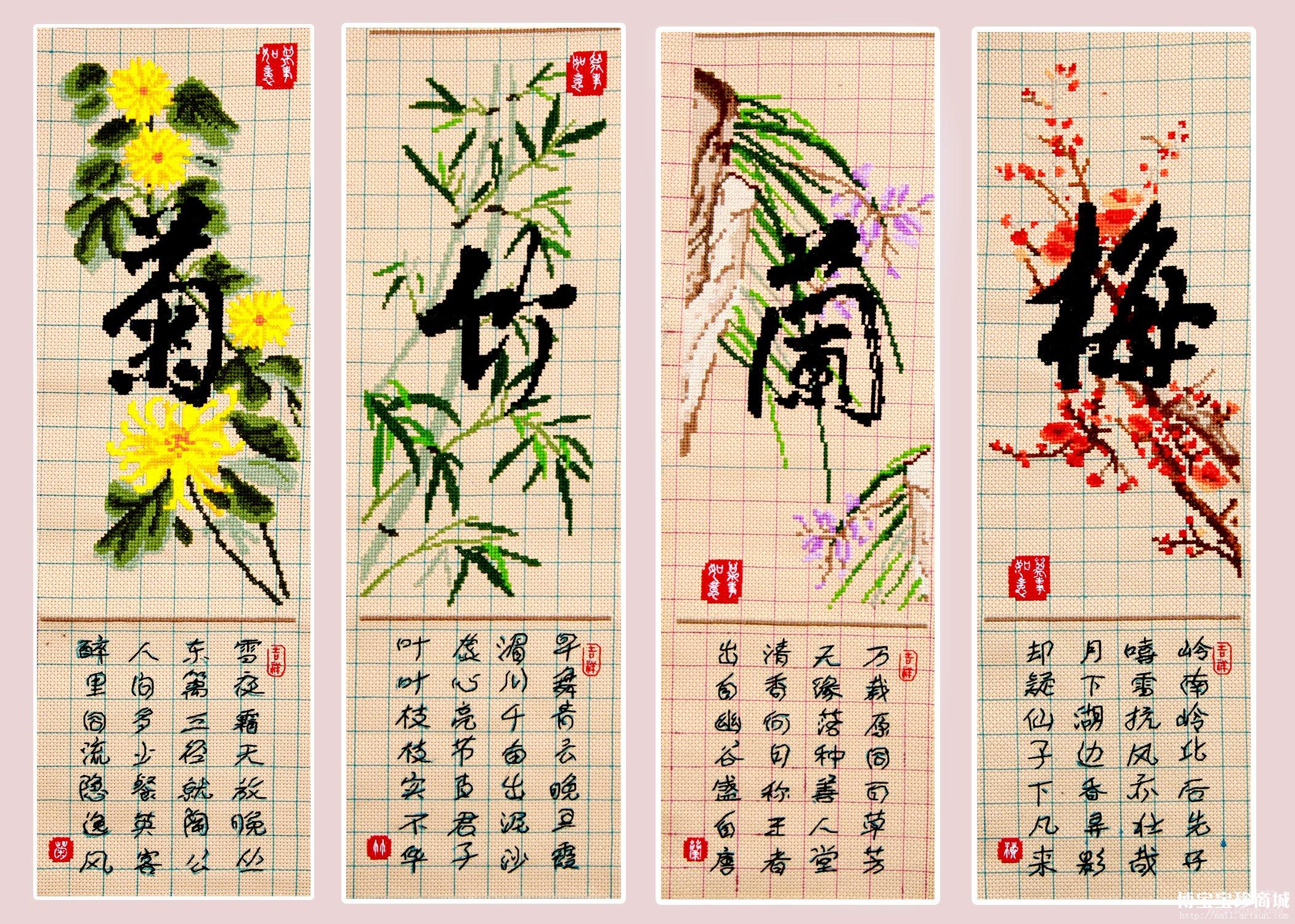 中国人对于花中四君子梅兰竹菊的称赞由来已久,自是达成共识。其幽芳逸致,风骨清高,不做媚世之态;涤人之秽肠而澄滢其神骨,致人胸襟风度品格趣味于高尚之品性,深博世人爱意。梅兰竹菊四君子,千百年来以其清雅淡泊的品质,一直为世人所钟爱,成为一种人格品性的文化象征,这虽然是自身的本性使然,但亦与历代的文人墨客、隐逸君子的赏识推崇不无关系。君子咏(梅兰竹菊)纯手工制作,图片为实物拍摄,技术有限,又没有进行任何加工处理,效果不能完全展现出来,还可能会有色差,但是实物色彩更加鲜明,尚未装裱,装裱后效果绝佳。