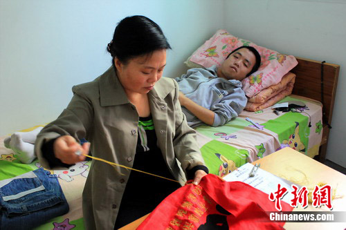 11月4日,四川省宜宾市南溪县新钟灵街居民周晓英在其廉租房里向记者展示了其刚刚创作完成的两幅巨型十字绣《琴棋书画图》、《韩熙载夜宴图》。这位朴素的母亲历经2年时间创作完成的巨型十字绣只为了一个美好的心愿:用十字绣换来的工钱救治25岁的儿子。
