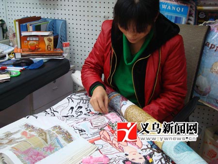 11月24日,在国际商贸城三区市场,一位姓秦的经营户正利用空闲时间编织一幅长3.6米,宽1.4米的巨型十字绣——《琴棋书画图》。整幅图由18位栩栩如生的古代美女组成,秦女士从去年12月份开始,到目前正在绣第14位美女,预计完成整幅十字绣需要一年半时间,这也是她首次尝试如此“浩大的工程”。据介绍,曾有个香港客商欲出资10万元人民币购买类似的手工十字绣作品,这让部分市场经营户寻觅到新的商机。