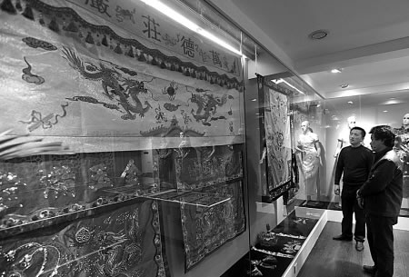 走进位于鄞州创新128园区的金银彩绣艺术馆,首先映入眼帘的就是一幅有着浓郁地域风情的《甬城元宵图》,这幅由鄞州金银彩绣的传承人史翠珍、张世君、沙珍珠、陆亚菊等人创作的作品,将250余名人物的欢庆热闹场面绣入画面,融入了宁波地域文化特色。在上下两层共850平方米的艺术馆内,共展出了300多幅金银彩绣精品,不但有衣服、屏风等大型作品,也有绣花鞋、荷包、挂件等小饰品,每件作品凝聚着浓浓的“阿拉宁波味道”。