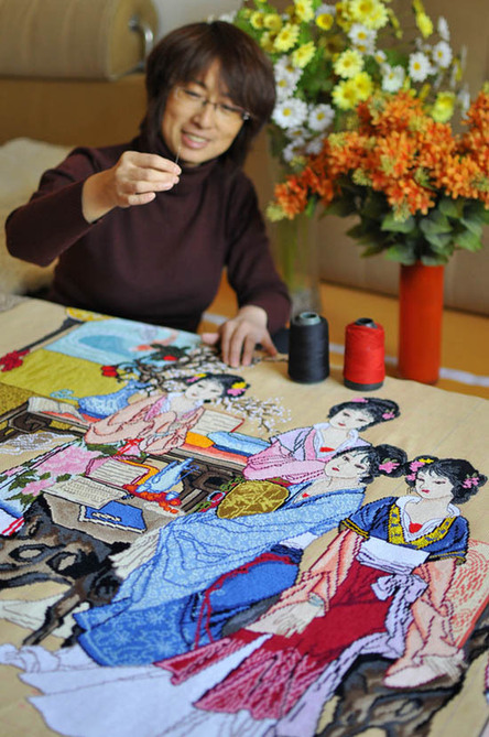 山西运城市民闫念琦选用43万多根彩线,历时一年多完成了长3.6米、宽1.5米的十字绣作品――《琴棋书画》,惟妙惟肖地刻画了18名古代女子展示琴、棋、书、画的灵秀表演。