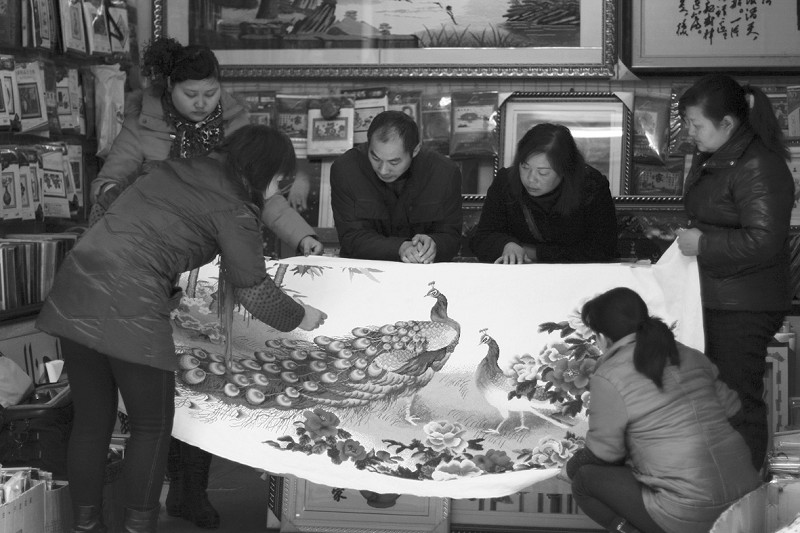 “他在店里绣,回到家里也绣,绣到晚上12点多了,才在我的催促下依依不舍地放下绣针。”妻子曹武梅夸奖张浩说,“他的绣品不仅正面绣得平整,背面也很规矩,花色搭配也很协调。”