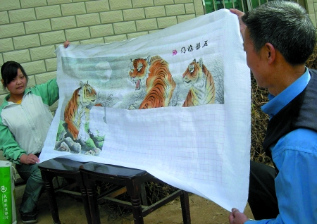 安静地坐在木凳上,全神贯注地穿针引线,灵巧的十指捏着细细的针线在一幅十字绣上运走如飞。在这幅未完成的十字绣作品中,三只老虎跃然纸上,雄壮威武,气势磅礴,栩栩如生……当记者见到这位叫鄢海霞的姑娘时,她正安静地绣着一幅名为《五福临门》的十字绣。她要在这幅长约2米的十字绣作品中,绣出五只形态各异的老虎,取谐音为“五福临门”。