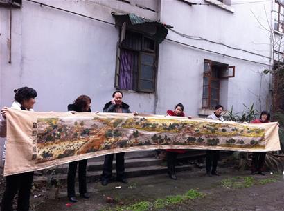 昨日下午3时许,在双林路一家小区内,田春容的丈夫齐兴汉从背包里小心翼翼拿出画布。“哎哟,好重!”齐兴汉提着重重的布料说。围观的人立马打起了帮手。在6个人帮助下,“清明上河图”的十字绣才露出了真面目:它长6.5米,宽0.7米,流水、扁舟、水牛、脚夫挑着木桶……人物栩栩如生。