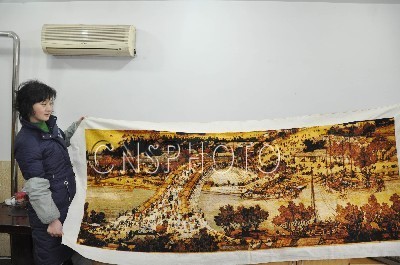 近日,四川省万源市太平镇村民宋志英花费了一年的时间,用十字绣绣出了一幅长2.31米、宽0.88米的《清明上河图》。宋志英告诉记者,《清明上河图》中有数百个人物、建筑物、动物和植物,颜色达30多种,为了不出错,她细致地在图样上编上顺序号码,十字绣版的《清明上河图》刚完工,就有人慕名找上门,表示愿意出数万元人民币购买此画。图为宋志英展示她的十字绣版《清明上河图》。