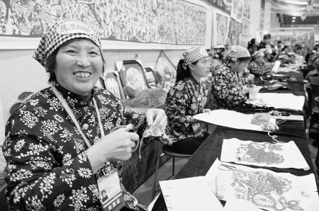 图为陕西定边妇女史宏丽在进行陕北剪纸手工艺展示。